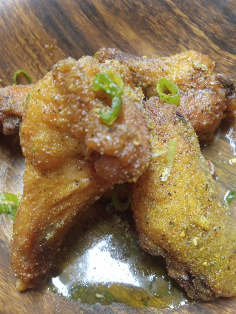 12 Farmers market fresh wings, with the choice of our house sauces (lemon pepper, barbecue, Buffalo, Asian sweet chili), and fries.